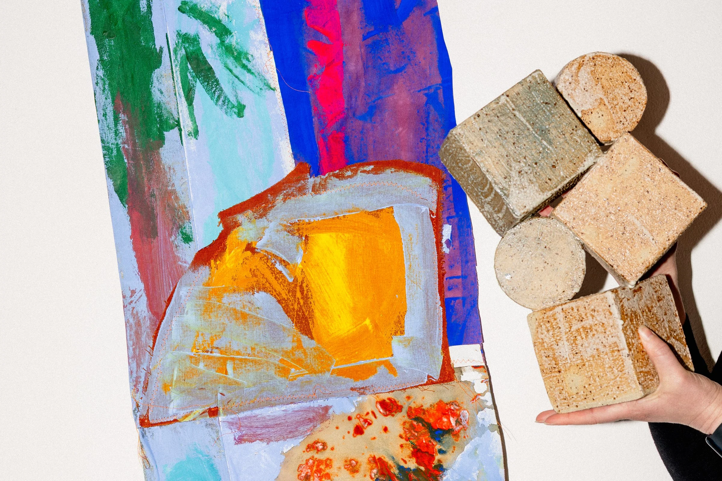 A Hullabaloo is noisy, it forces our attention. Desmond and Childs are interested in how ‘noisy’ aesthetics can excite new material possibilities. Being a ceramicist and painter, respectively, involves working within some type of historic system. Some rules must be followed to create an object, yet these systems can be expanded. Both artists are driven by process-based systems that interrogate the assumptions of their chosen mediums. Yet, there is an awareness of the autonomy, or memory, of materials. Clay and paint each hold the marks of the making—though this is not a one-sided exchange. Desmond and Childs are conceptually interested in the tension between intuition, modes of automation and moments of disruption and chance that occur when you forfeit complete control. Sculptural forms and painted shapes recur as each artist experiments with their systems of making, with each form contributing its own voice. Material agency underpins this exhibition.